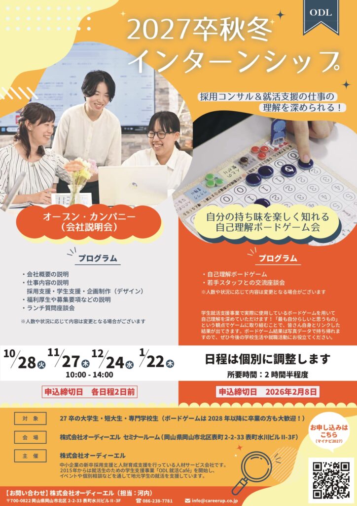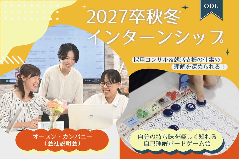 秋冬のインターンシップでは、会社説明会(オープンカンパニー)を4日程、個別調整で自己理解ボードゲーム会を実施いたします。皆さんにお会いできることを楽しみにしています!