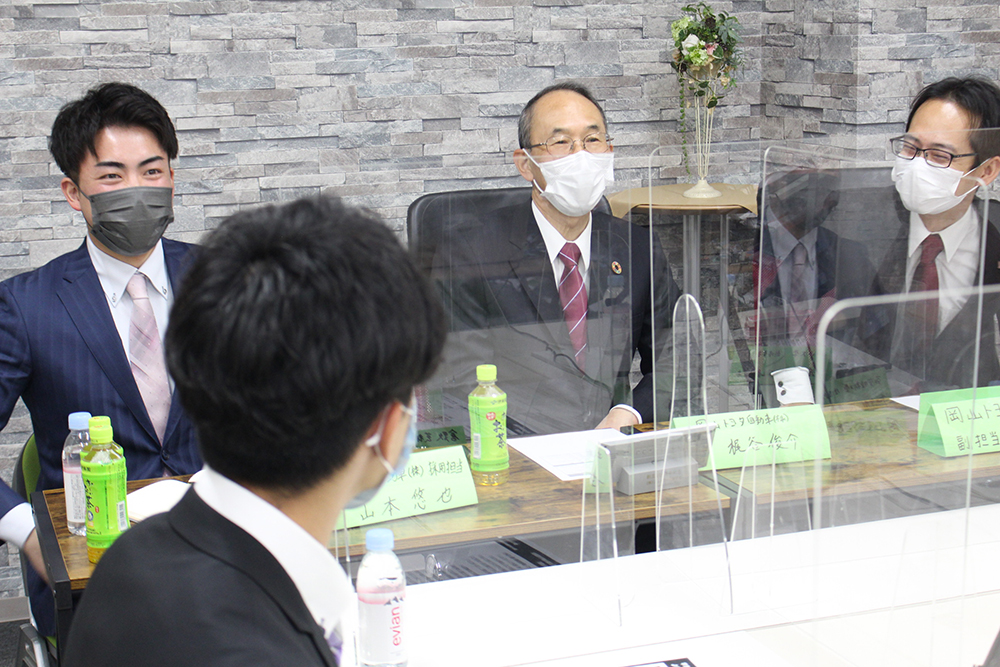 毎回ご参加いただく役員の方が異なる岡山トヨタ自動車株式会社さんですが、最終回の今回は梶谷社長、採用担当の山本さん・太田さんの3名にご参加いただきました。対面とオンラインとの同時開催で社長の想いや社会人としての姿勢など、様々なお話を伺うことができました。