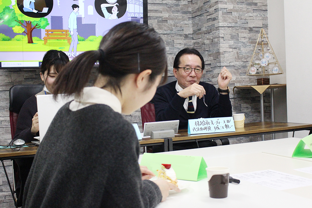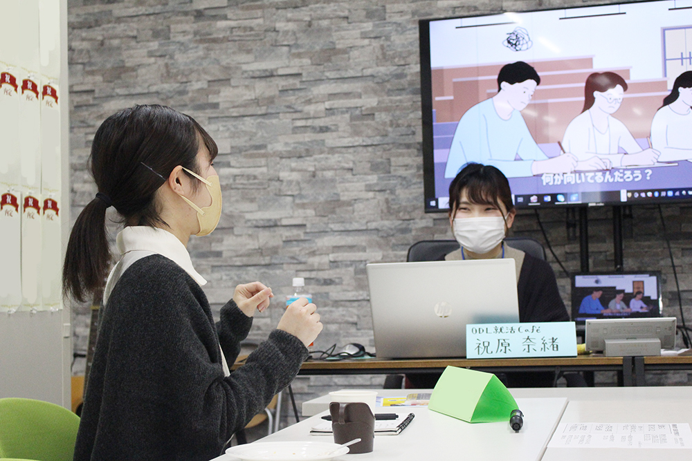 今回は当社オーディーエルの2回目の回でした。代表取締役の堀江とスタッフの祝原・計盛が参加し、学生さんと企業さんとの交流を行いました。