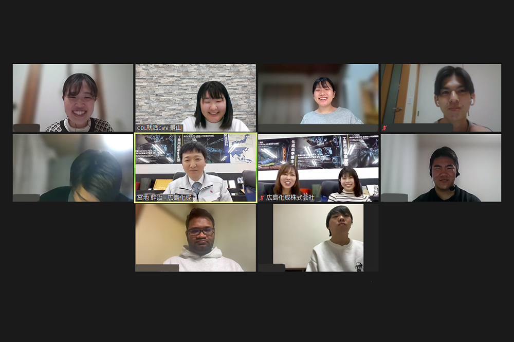今回はオンラインでの開催で、「広島化成株式会社」さんにゲストでお越しいただきました。宮地社長、採用担当の麻生さん、藤村さんの3名にご参加いただきましたが、社長・社員さんのかけあいからフランクな雰囲気が伝わって来た楽しい座談会でした。