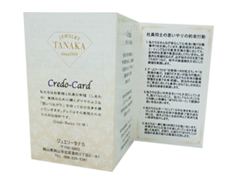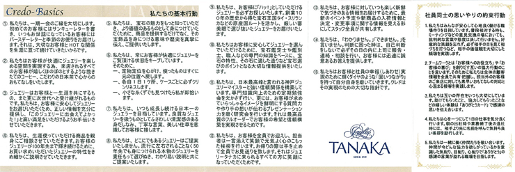 宝石店として出来上がったジュエリー・タナカのクレドは、お客様に宝石を持つ喜びや、世代を超えて末長く愛してもらうために、一つひとつの宝石のことを事細かに伝えていく使命感を盛り込んだ大切なものになりました。