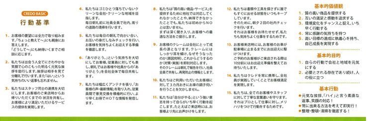 立派なクレドが完成し、これから宣言した上で実行していくことへのプレッシャーを感じました。今はクレドを常に持ち歩き、目を通すことで自覚し、会社のところどころに貼って意識を高めています。また、項目がたくさんある中で、まだ全く手のついていない所もありますので、その部分をマンスリーミーティングで改善を行っていくことが今後の課題です。