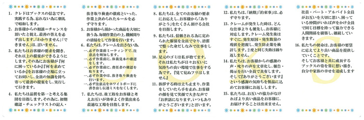 私たちは「モノづくり」を通じて、紙の文化を伝え続けることにより、『人とのつながり・豊かな発想』を育てることを使命とします。私たちは、自分の一番大切な人に本を届けることを思い浮かべ、お客様の想いの詰まった商品を提供することをお約束します。私たちは技術と知恵と心を込めた「モノづくり」で、品質日本一を目指します。
