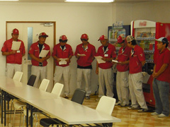 また、工場見学者の方々への挨拶の仕方がなかなかうまく実践されないため、決めた挨拶の仕方の発声練習もしています。