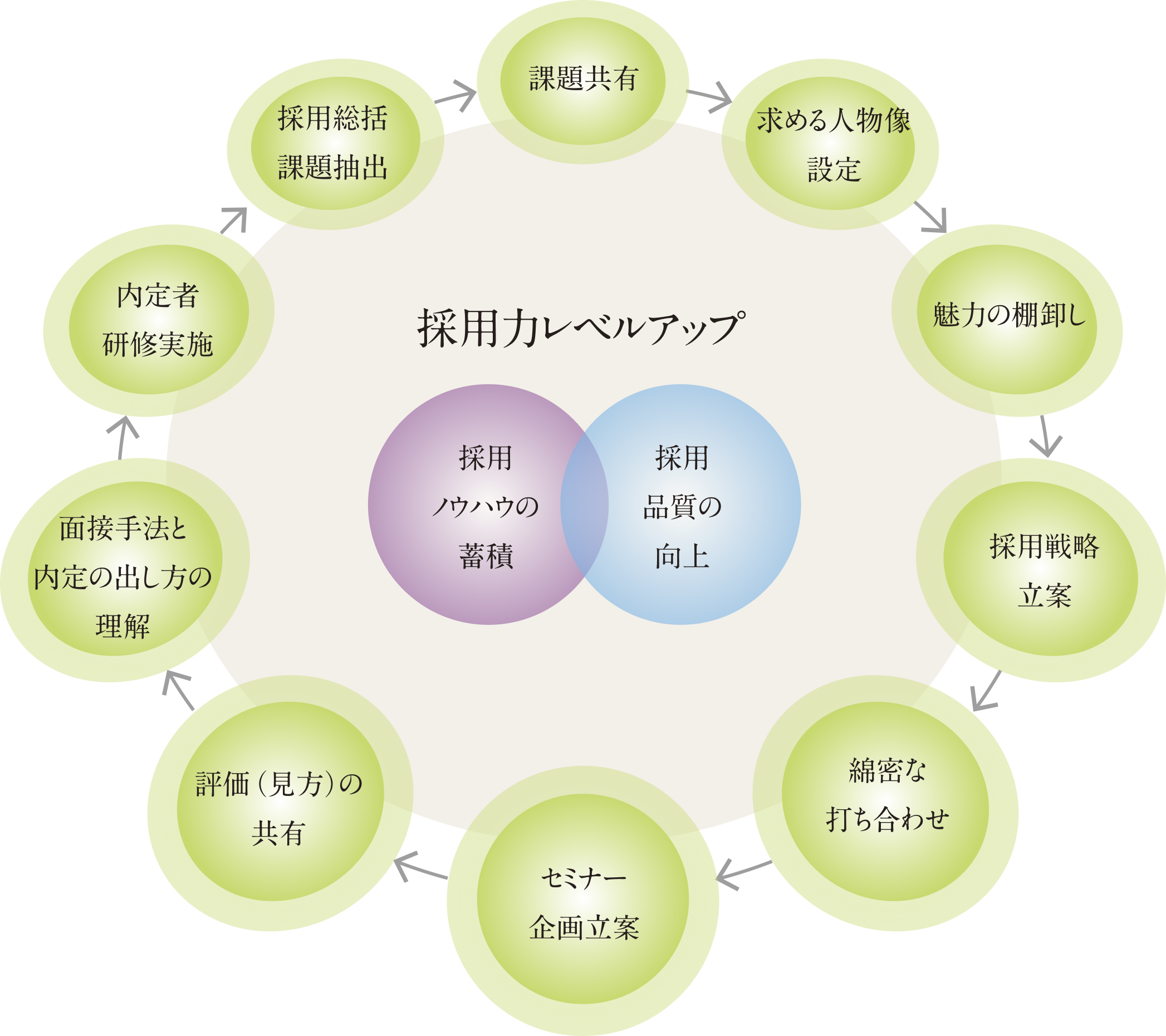 また、貴社の採用ノウハウを蓄積するために、採用業務の標準化、採用プロセスの数値化を徹底します。そして、採用経験豊富なスタッフが、万全の体制で対応を整え、貴社の充実した採用活動をバックアップします。