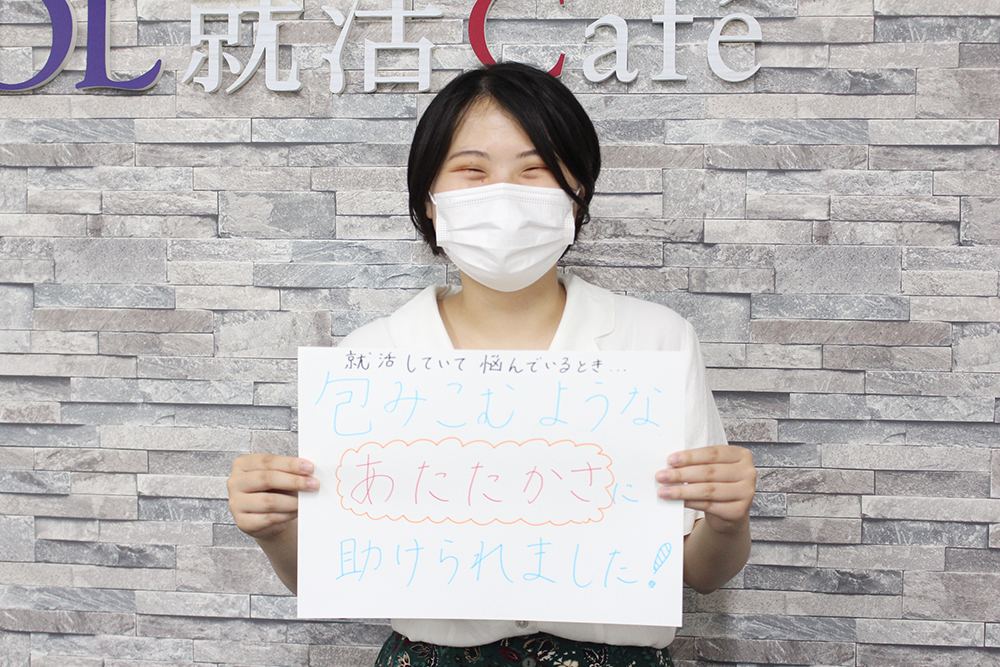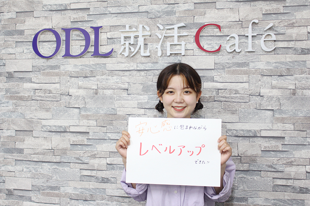 不安が消えて、就活に対するモチベ―ションがアップしたところが良かったです。私は、就活の進め方も何からやって良いかも分からず不安でいっぱいだった頃、先輩にODL就活Caféを教えてもらい登録しました。初回の個別相談では、まず今自分がしなければいけないことが明確になりました。SPI対策や面接練習と就活準備を進めていく中でも新たな不安が出てきましたが、そのたびにODL就活Caféに来て相談することで不安も解消されました。私が就活を頑張れたのは、皆さんに話を聞いていただき、アドバイスしてもらったからだと思います。